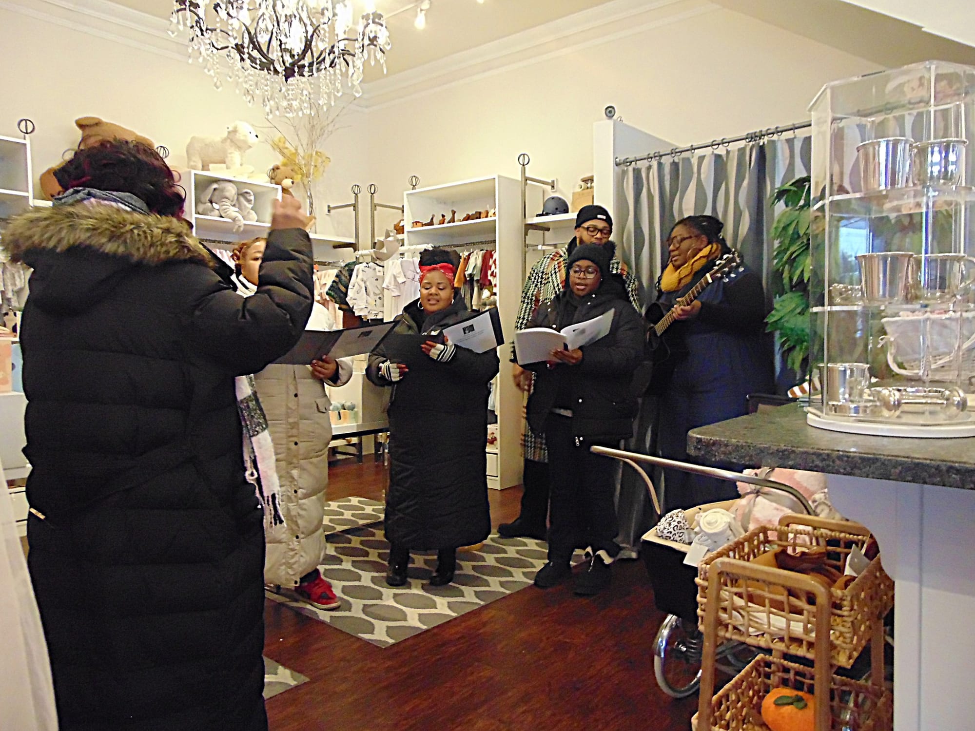 The voices of Winters & Company spread seasonal cheer in Taylor and Max.
