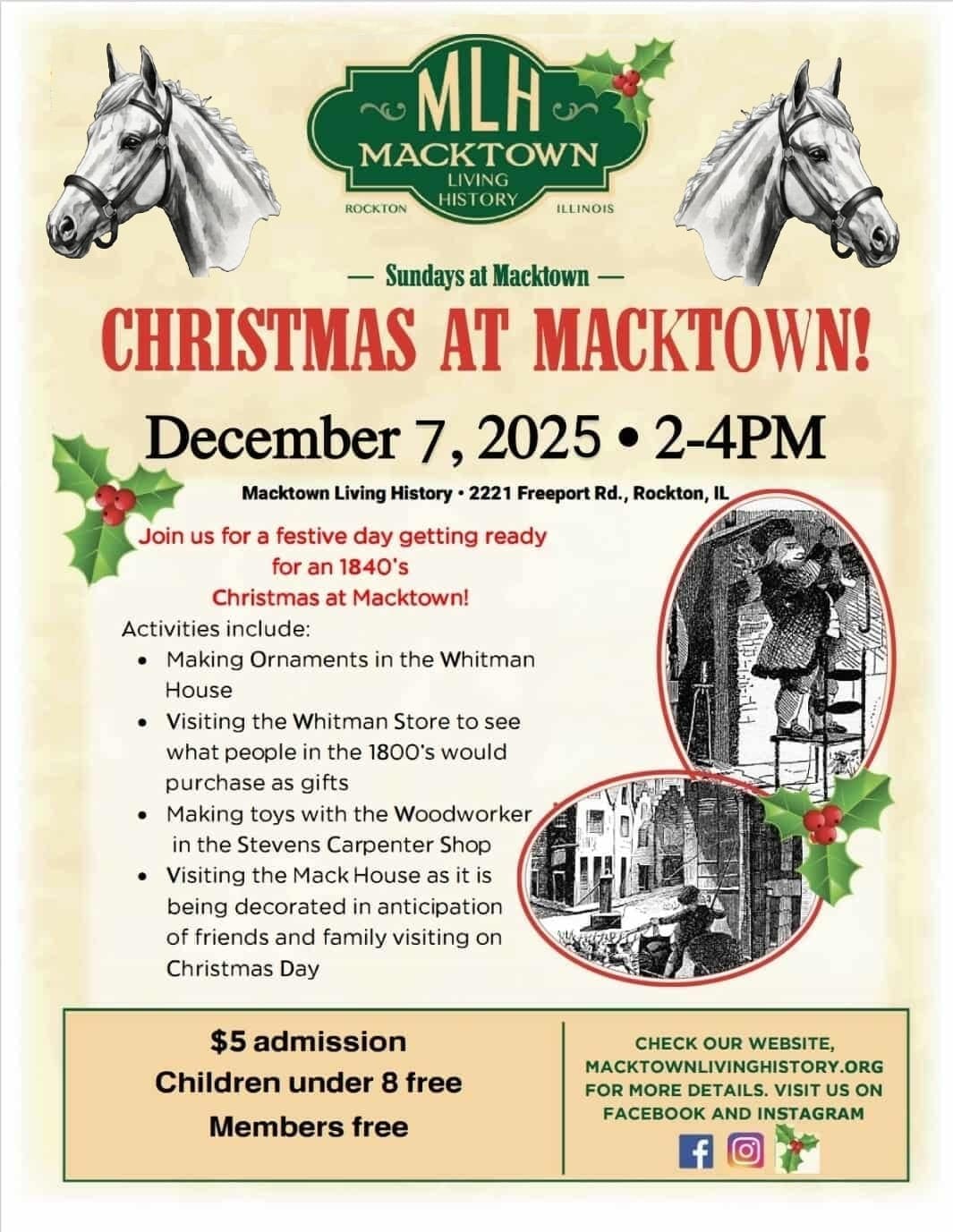 Sun Dec 7, 2025, 2 - 4 pm, Macktown Living History, 2221 Freeport Rd, Rockton IL, 61072
