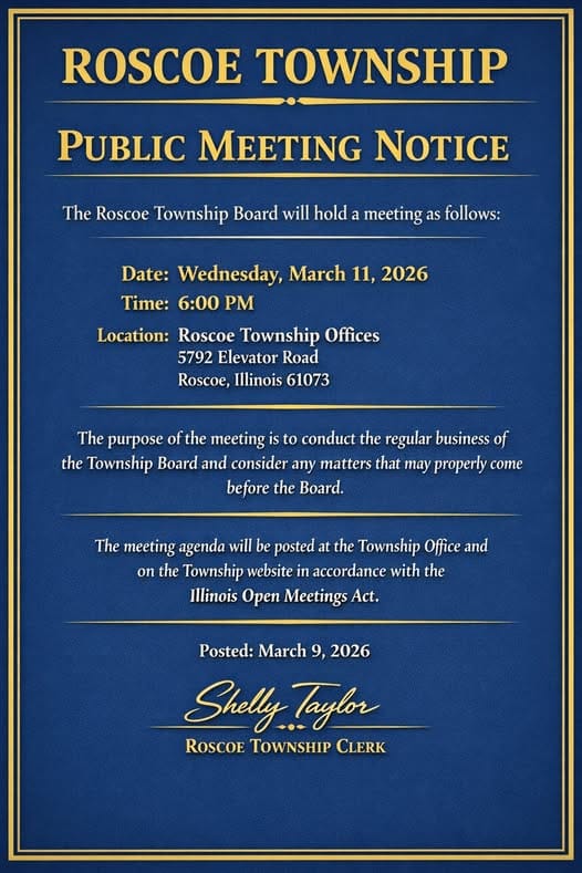 Wed Mar 11, 2026, 6 pm, Roscoe Township, 5792 Elevator Road, Roscoe IL, 61073