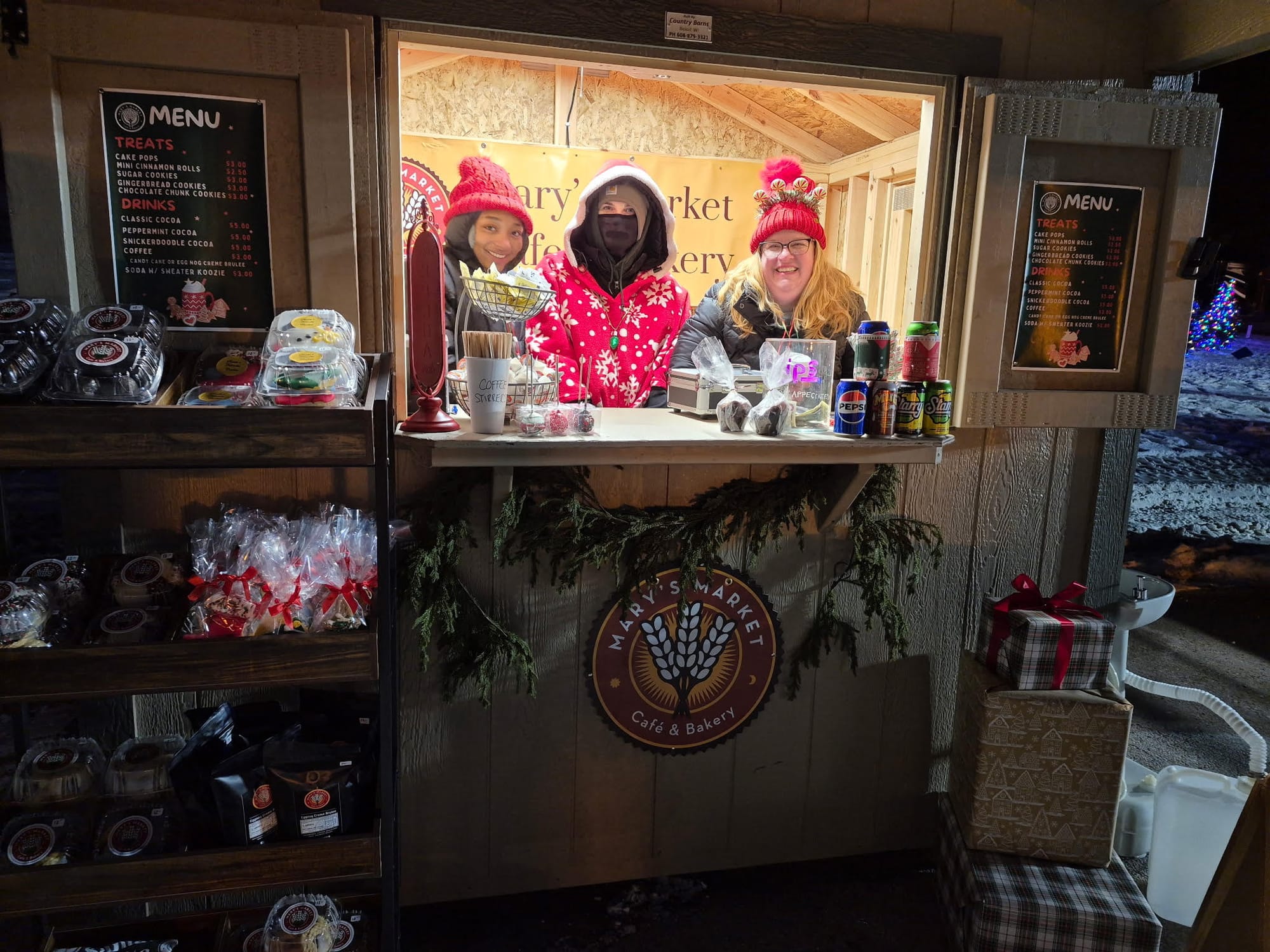 Christmas huts were set up along Main Street. Poison Ivy Pub, Mary's Market, and Sebastian's Cafe each offered unique food or drink items. Sebastian's offered churros which proved to be popular - they sold out.