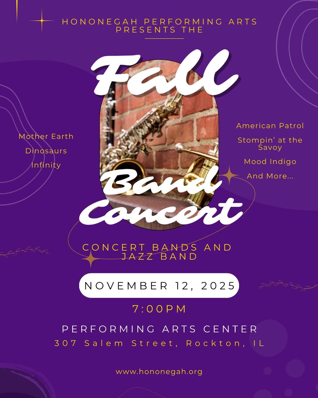 Featuring the Combined Concert Bands and the Jazz Band for an incredible concert. Musical numbers include Mood Indigo, American Patrol, Mother Earth, Dinosaurs, Infinity, and Stompin' at the Savoy. The concert will be livestreamed at www.hononegah.org