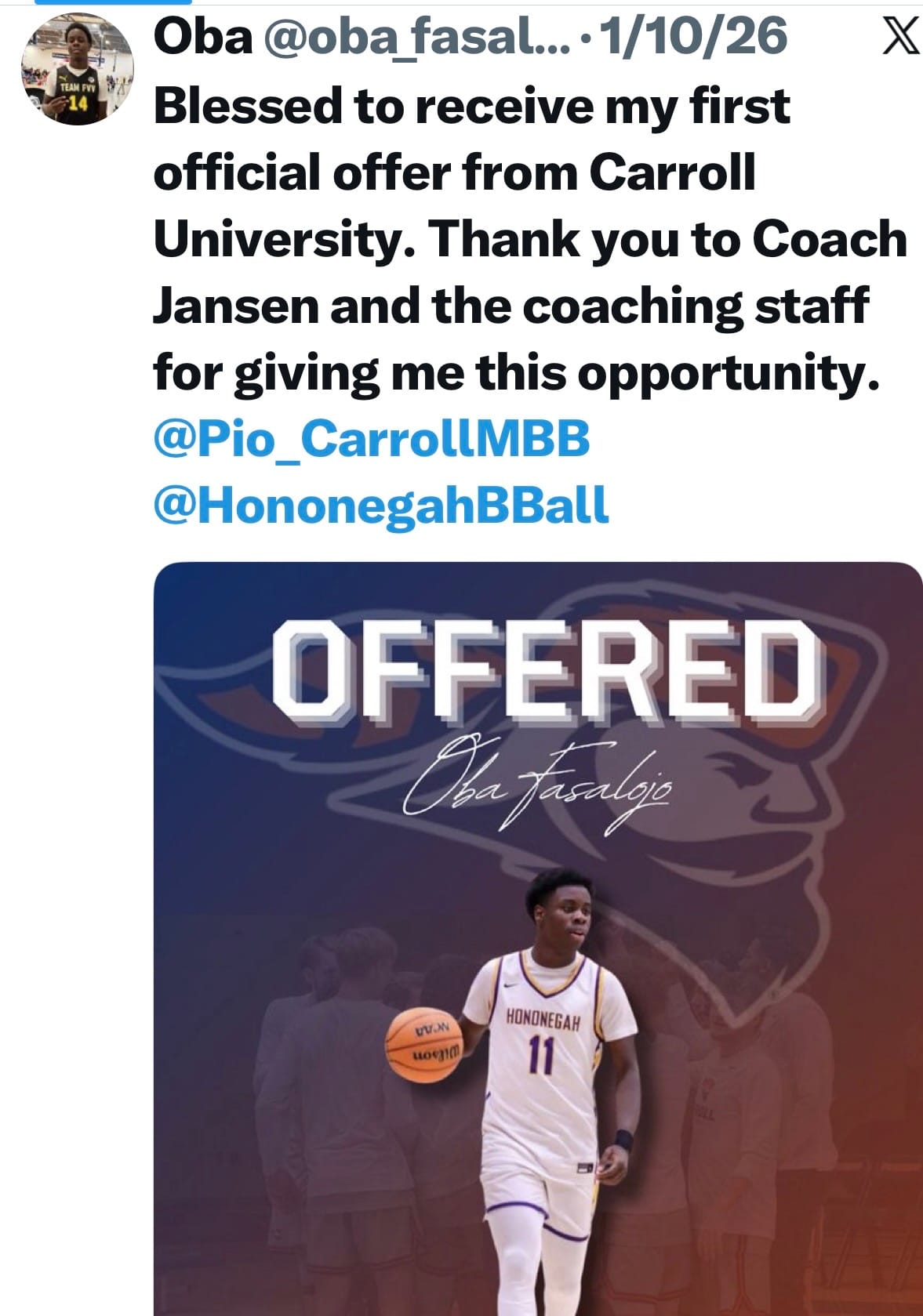 Fasalojo recently received his first official college offer from the Carroll University Pioneers, an incredible opportunity for him.