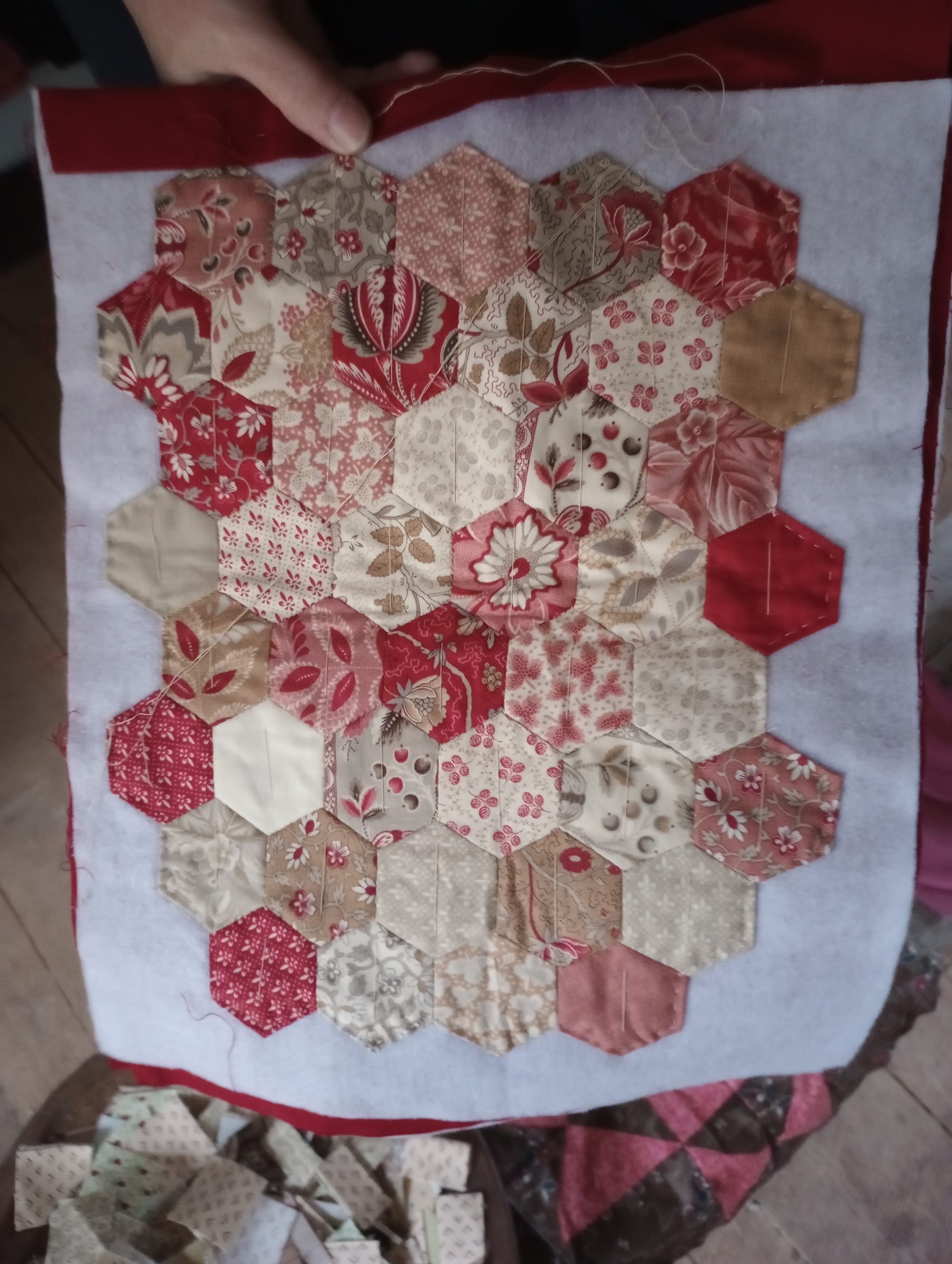 Ms. Harper tried to sew it by machine and tried using rubber stamps of the shapes. After using both those methods, it "collapsed." She will continue on by hand, making modular piece sets and sewing them together.