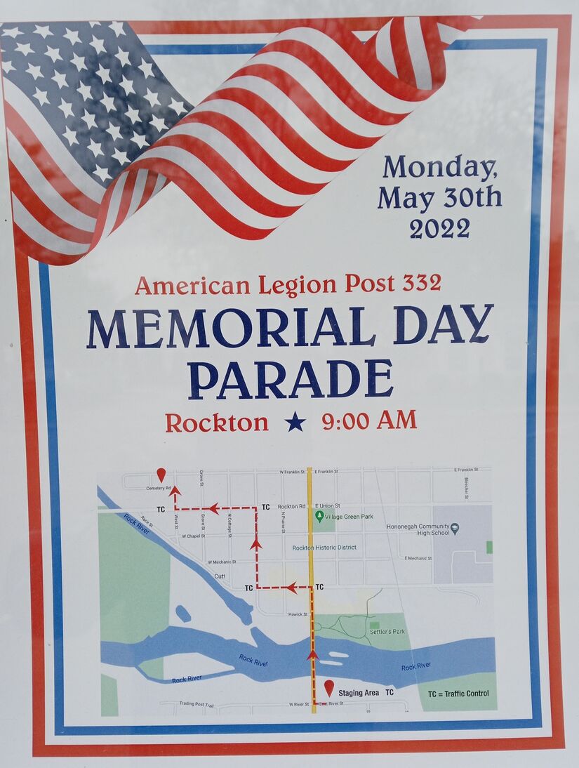 The Rockton Memorial Day parade, organized by Rockton American Legion Post #332, begins at 9:00 a.m. on Blackhawk Blvd. on the south side of the bridge over the Rock River, where veterans lay a wreath into the water, and heads north to the Rockton Township cemetery, with a short ceremony afterward. The parade usually includes the Hononegah High School Band.