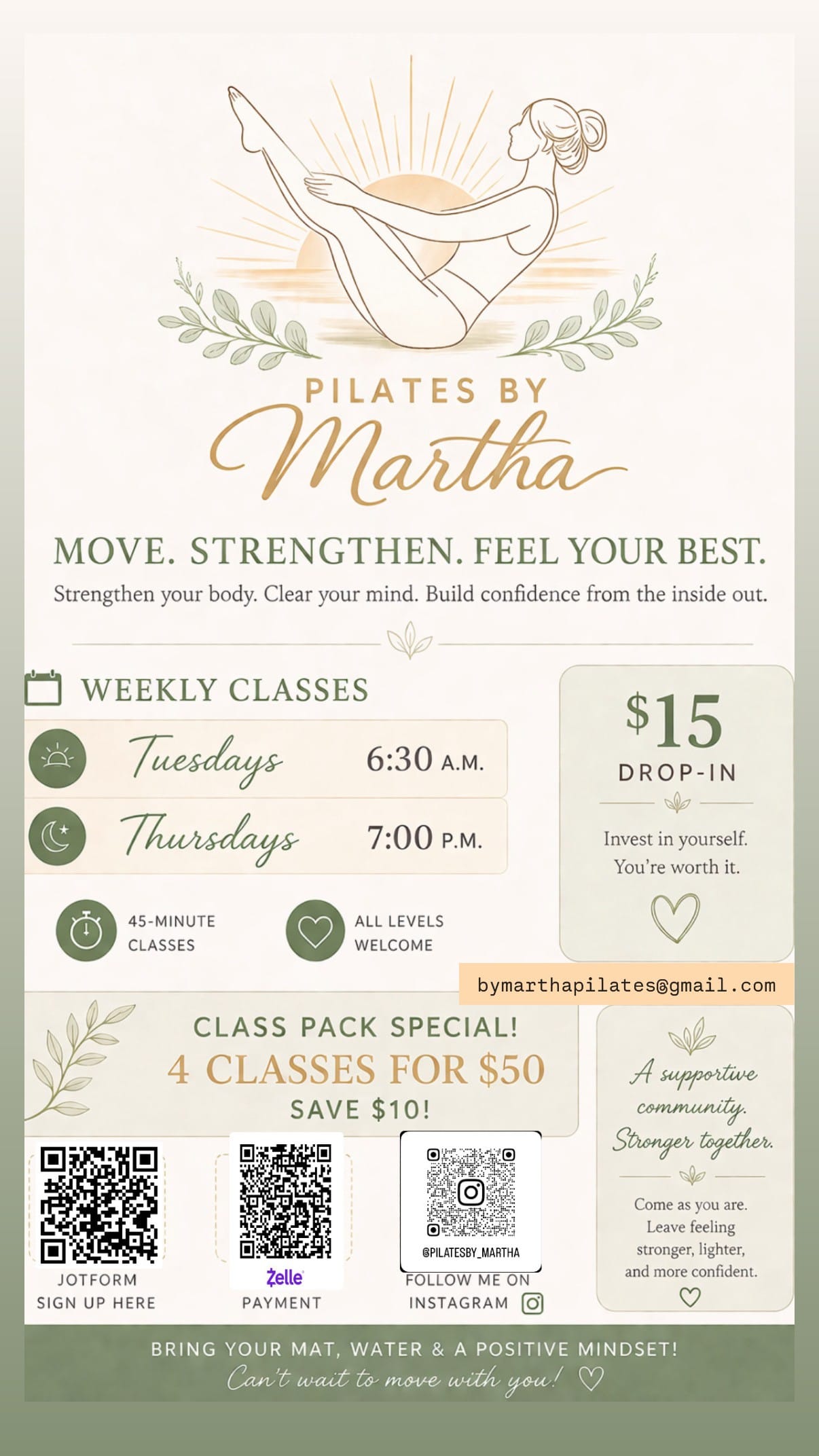 Drop in for a class for $15 or sign up for the 4 Class Special by filling out this form. Questions? Email Martha at [email protected].