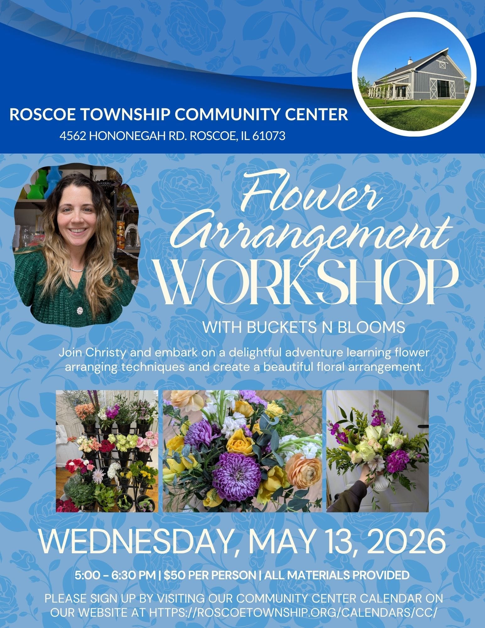 Want another way to get together and celebrate the women and mothers in your life? Join us after Mother's Day and discover the art of flower arranging in Christy's engaging workshop at the Roscoe Township Community Center!