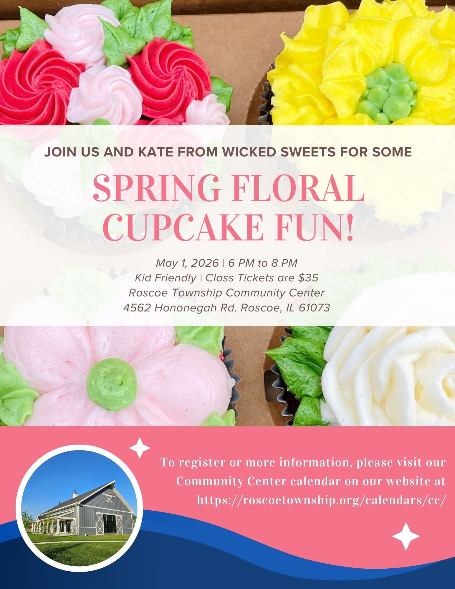 Join Kate from Wicked Sweets at the Roscoe Township Community Center for some spring floral cupcake fun! In this hands-on decorating class, you will learn how to create 6 different floral designs out of buttercream frosting on top of 6 vanilla cupcakes. All materials and aprons provided, just bring yourself and your willingness to try new things!