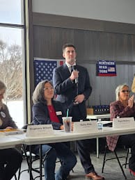 Total attendance was estimated at 170 people, many of them from outside Roscoe. The parking lot and the side lot were full, leaving some attendees to walk on the side of the road. The remaining crowd filled in empty spaces at the back to hear a slate of local, state, and federal candidates pitch their case as to why they are the best pick for the March 17 primary.
